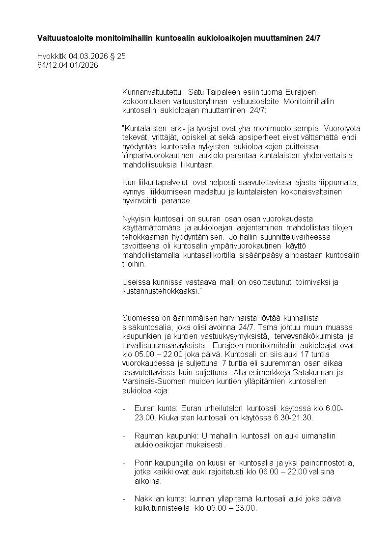 | Valtuustoaloite 2026 / monitoimihallin kuntosalin aukioloaikojen muuttaminen 24/7 | ||